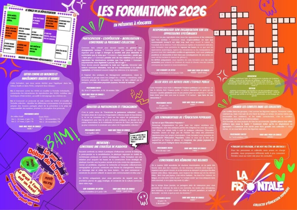 Nos formations ont toutes un but commun : apprendre à mieux s’organiser collectivement en nous désintoxiquant des codes culturels du partiar-caca-pipi-talisme ! Ou dit à l’envers : apprendre à nous organiser de manière plus humaine.